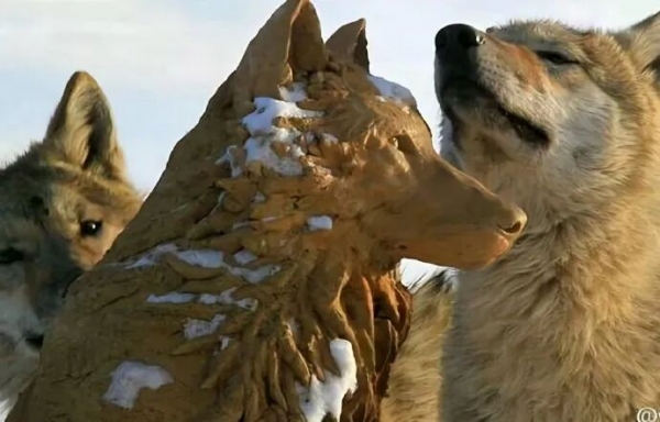 电影中,以格林儿子"双截棍"遗骸加入黏土做成的狼雕泥塑,成为草原上一道风景。