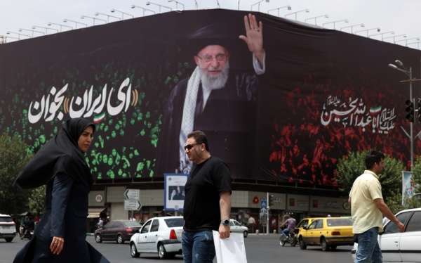 2025年7月9日,伊朗人走过一块巨大的广告牌,上面印有哈梅内伊的照片和波斯语引文"歌唱吧,伊朗"。 IC Photo
