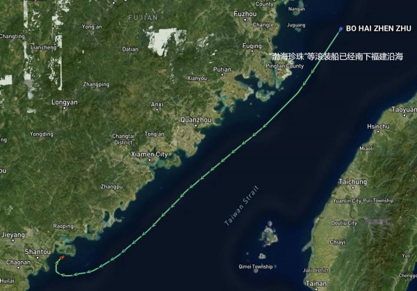 首先,就在西方媒体关注解放军与海警船只动向的时候,至少2艘渤海轮渡公司的民用滚装船离开渤海湾,南下抵达了福建沿海地区。