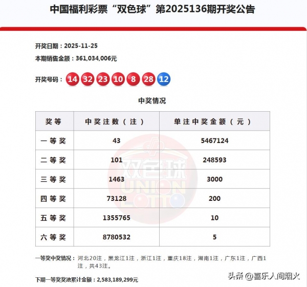 本期双色球开出 43注一等奖,分落 7地,每注奖金 546万,开奖后奖池滚存为25.8 亿。。