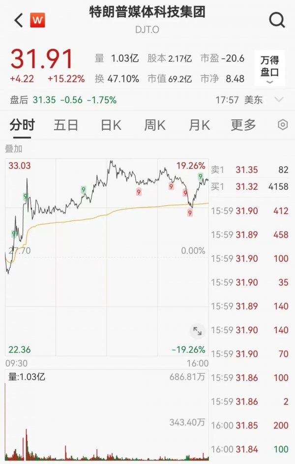 美东时间11月8日,"特朗普交易"核心炒作股--特朗普媒体科技集团股价开盘微跌,随后大幅上扬,最高涨幅达19.26%,最终收于31.91美元,涨15.22%,