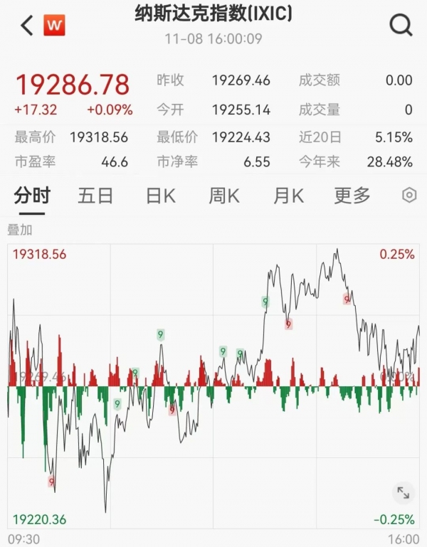 美东时间11月8日,美国三大股指全线收涨。截至收盘,道指涨0.59%,报43988.99点;标普500指数涨0.38%,报5995.54点;纳指涨0.09%,报19286.78点,均再创历史新高。