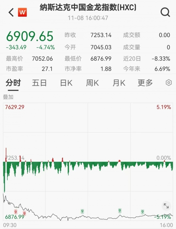 11月8日,中概股普遍下跌,纳斯达克中国金龙指数大跌4.74%,万得中概科技龙头指数跌5.75%。