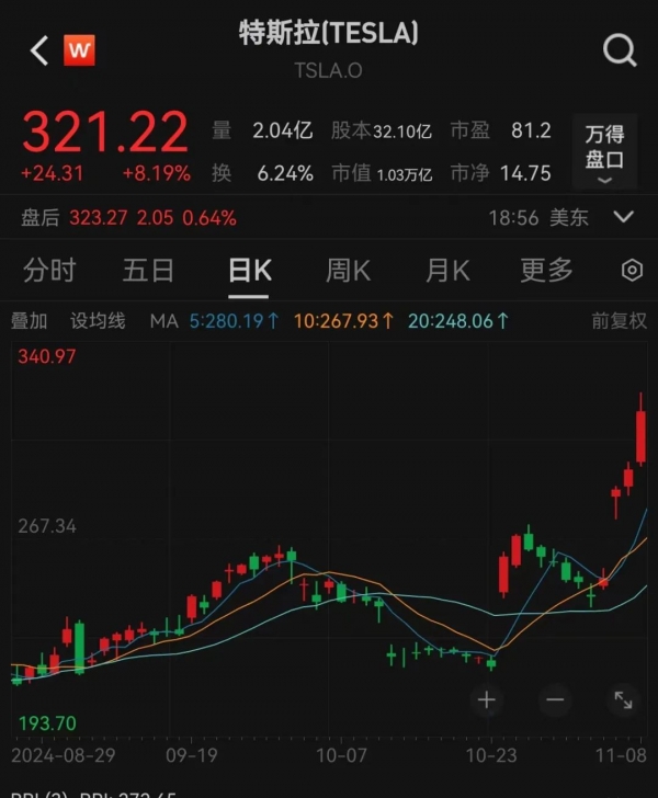 特朗普赢得美国总统大选后,"头号功臣"马斯克旗下的特斯拉公司股价猛拉。
