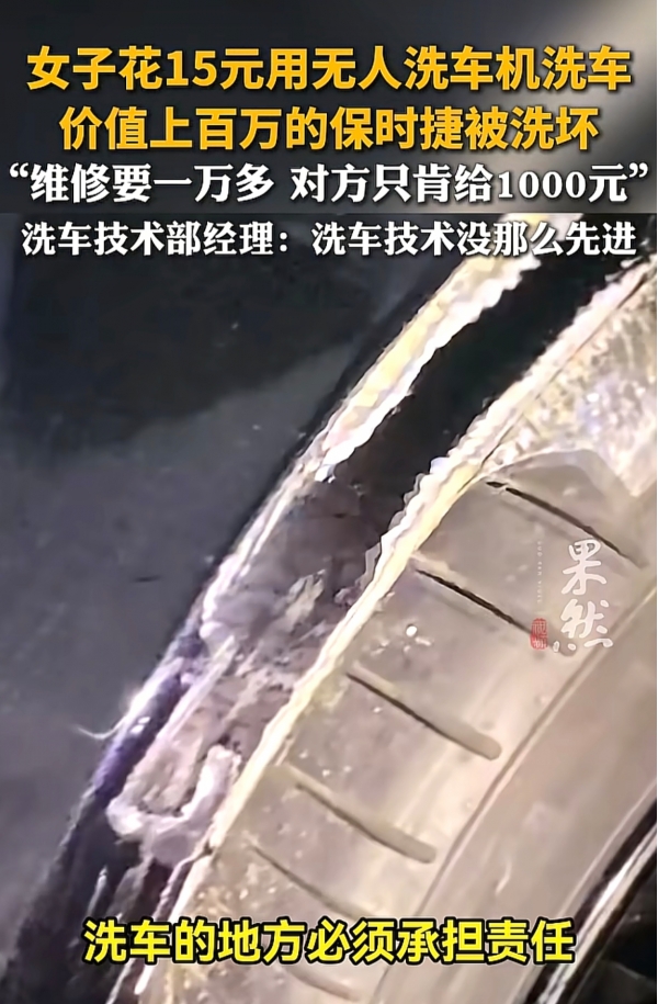 2月6日,杭州的卢女士想图方便花15元在地下停车场的无人洗车机洗百万保时捷,全程按提示规范操作,反复调整车位、收起后视镜,可洗车机钢架突然刮蹭车身,导致前保险杠、轮眉等多处车漆受损,隐形车衣也大面积撕裂。她第一时间按紧急制动仍无法挽回,4S店定损后维修费用高达1.2万元。可找洗车机运营方维权时,对方先是承认设备技术有缺陷,却只愿赔偿1000元,还以低价服务为借口推脱,后续甚至提出责任各半的方案,让卢女士陷入维权困境,目前市场监管部门已介入调解。
