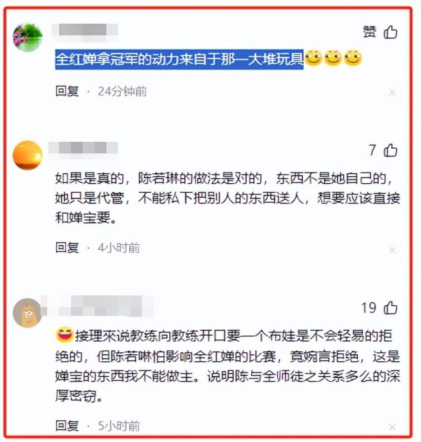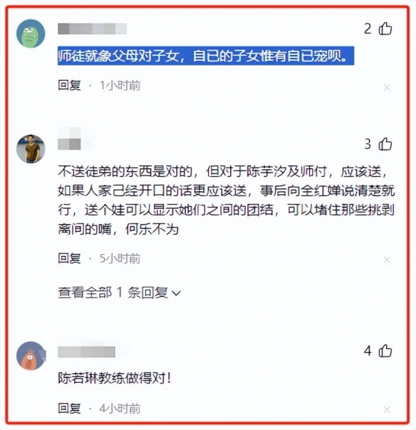而当陈芋汐的教练看到这一幕,也动了心思,想要给自己的徒弟也来一个娃娃。可谁知,陈若琳直接拒绝了。这可不是小气,这是尊重,是对弟子的尊重,得经过全红婵的同意才行,对弟子心爱之物的尊重。这份尊重,让人不禁为陈若琳点赞。