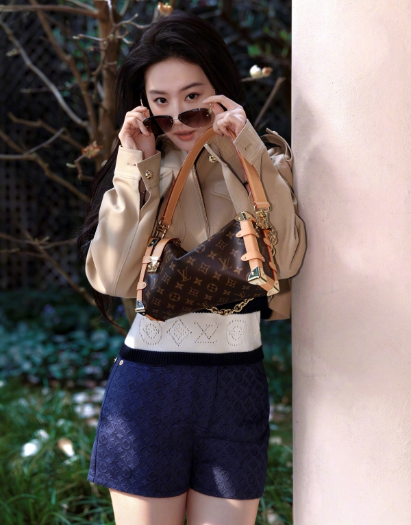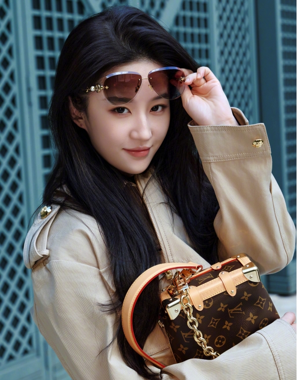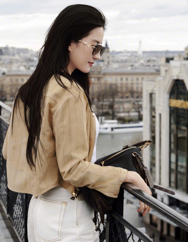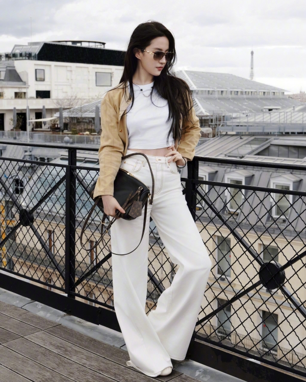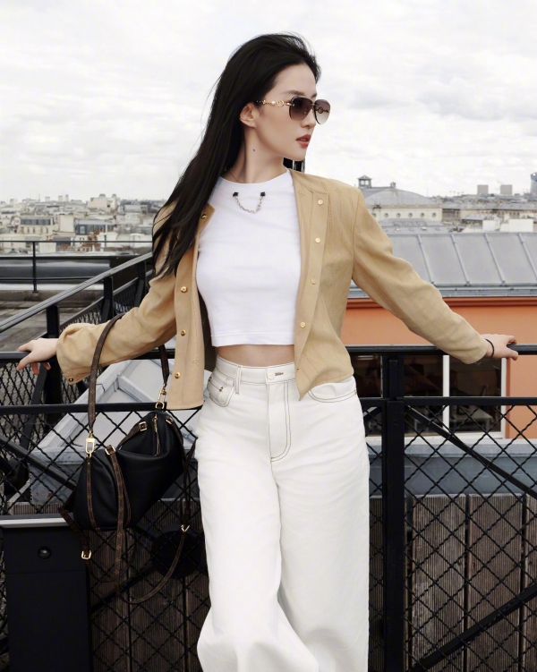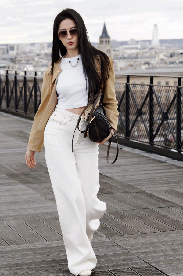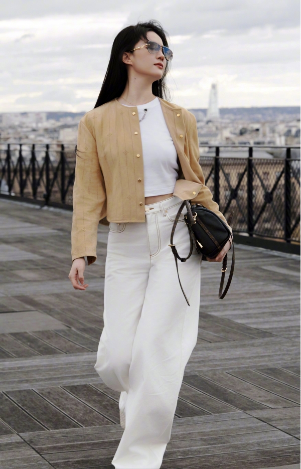 她的穿搭,是最懂高级感的减法哲学。一件卡其色短款镂空外套,内搭简约白 T,下身搭配垂感满分的白色阔腿裤,再配上 LV 经典包袋与复古墨镜,整套造型没有多余元素,却把 "松弛贵气" 焊在了身上。短款上衣恰到好处地露出腰线,阔腿裤拉长身形比例,卡其色与白色的碰撞,温柔又干练,既保留了法式慵懒,又带着东方女性的舒展大气。哪怕是换了卡其色风衣、短款针织与牛仔半裙的造型,她也总能用最简单的单品,穿出最不费力的时髦感。