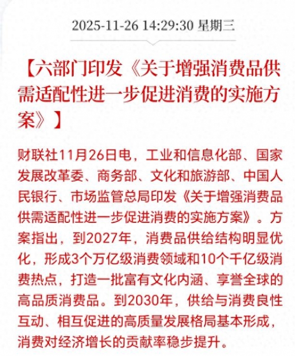 昨日尾盘,消费板块突然异动,多股迎来涨停。而在此背后,主要还是政策的刺激。11月26日,工信部、发改委等六部门联合印发的《关于增强消费品供需适配性进一步促进消费的实施方案》正式落地。实际上,在11月14日国常会就已经提出,而此次只是相关政策部署的具体落实。但和当时提出之际市场表现平淡相比,方案公布当日,消费板块便呈现出活跃态势,多只个股尾盘异动拉升并实现涨停,家用电器、商贸零售等细分赛道成为资金关注焦点,让"消费能否成为A股新上涨主力"的讨论成为市场热点。
