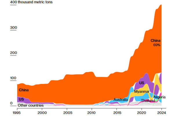 彭博社提到,中国是全球稀土的主要生产国,2024年占全球产量的近70%。