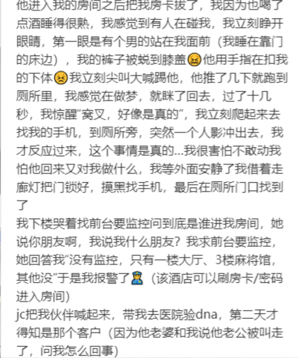 女子因为工作原因,来到四川出差,当天和一个刚认识的客户一起吃饭喝酒,之后这位客户"好心"地把她送到了酒店。