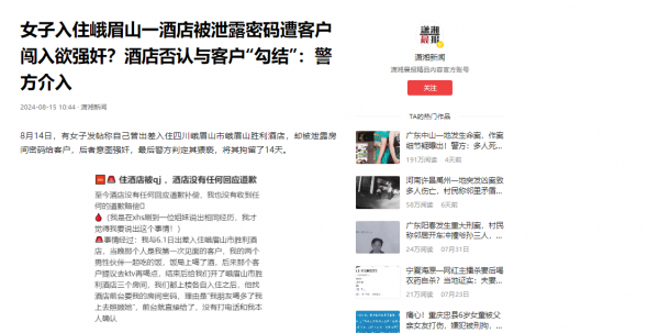 信息来源:潇湘新闻于二零二四年八月十五日发布的--《女子入住峨眉山一酒店被泄露密码遭客户闯入欲强奸?酒店否认与客户"勾结":警方介入》