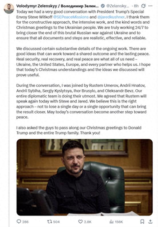 财联社12月26日讯(编辑 卞纯)综合央视新闻等媒体报道,当地时间25日,乌克兰总统泽连斯基在社交媒体平台X上发布消息称,当日他与美国总统特朗普的特使史蒂文·威特科夫、特朗普女婿贾里德·库什纳举行了良好的通话。