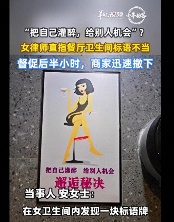 去上个厕所都能被膈应到,这种事儿你碰上能忍吗?1月25日,河北燕郊的安女士去一家常去的餐厅吃饭,本来是想解决内急,结果一进女卫生间,抬头看见一块标语牌,上面的内容简直让人血压飙升,赫然写着:"把自己灌醉,给别人机会"。