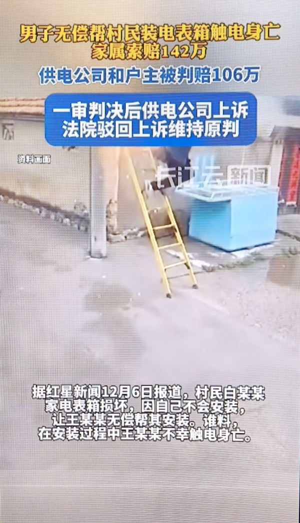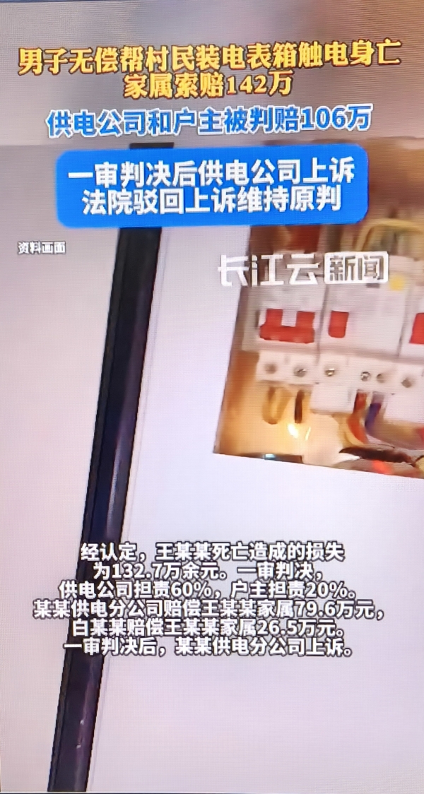 2024年7月,四川凉山州会东县村民王某某,在无偿帮同村白某某安装电表箱时触电身亡。其家属向供电分公司及白某某索赔142万元。2025年12月,凉山州中院二审驳回供电公司上诉,维持一审判决--供电公司与白某某共赔偿106万余元。