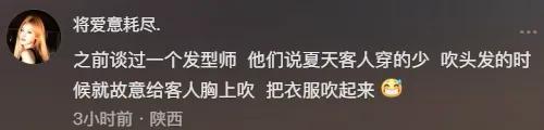 还有网友算是爆出了黑料之前谈过一个发型师 他们说夏天客人穿的少 吹头发的时候就故意给客人胸上吹 把衣服吹起来。