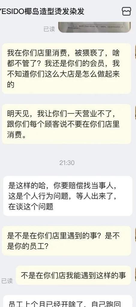 2025年7月1日晚上八点多,武汉椰岛美发金地雄楚店里人来人往。王丽是老顾客,躺下洗头的时候迷迷糊糊睡着了。突然感觉胸前被碰到,睁眼一看男店员的手还在衣服里。她当场问对方干嘛,店员说在做肩颈按摩。