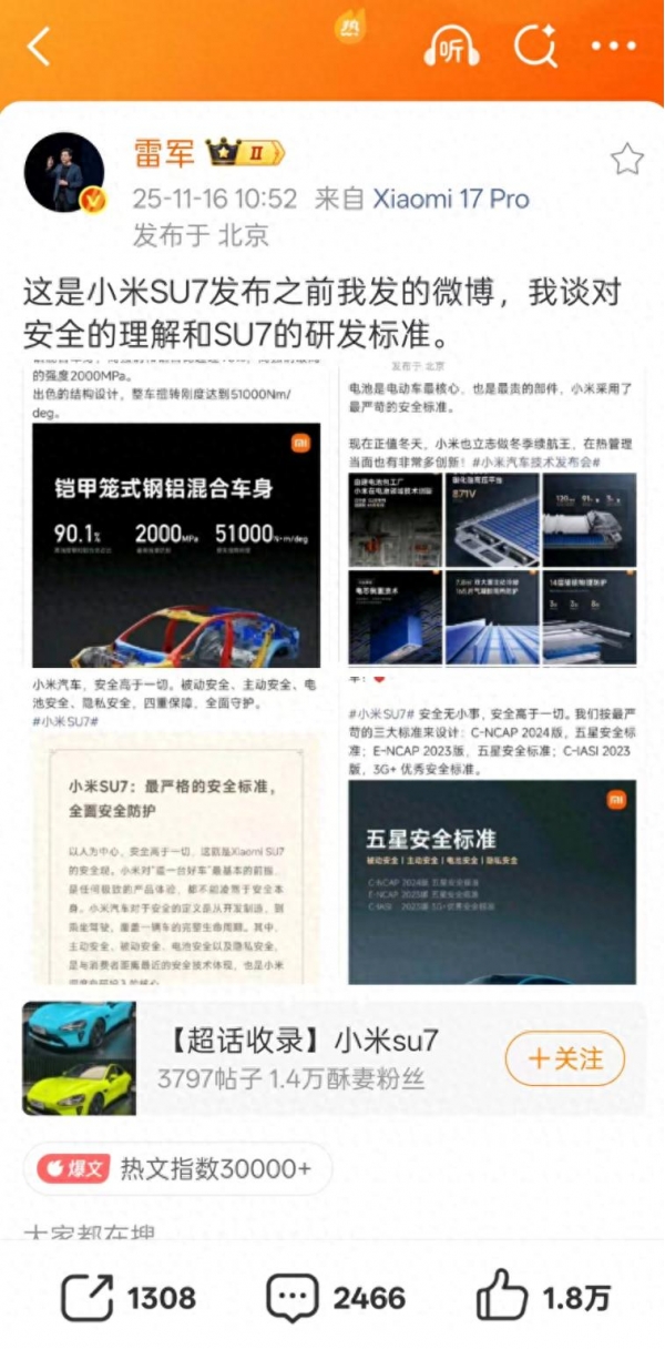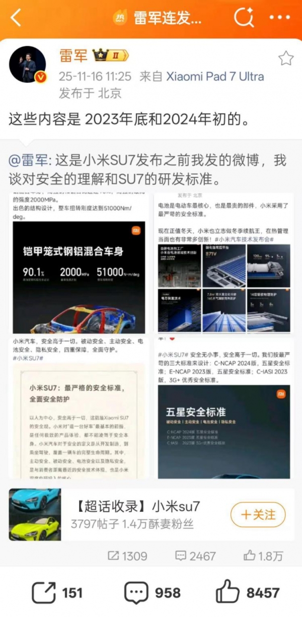 11月16日,雷军突然连发三条微博重申自己对汽车安全与设计的理解。他先是汇总了自己在小米SU7发布前关于安全认知及研发标准的多条旧微博,随后又在转发时补充发布时间,并在原博评论区追加数条回复。