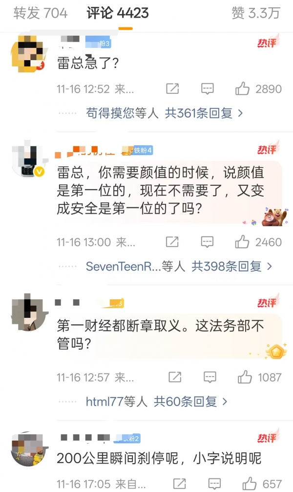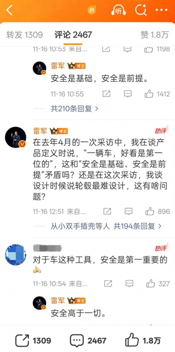 比如,雷军反问,"我谈设计时候说轮毂最难设计,这有啥问题?"这句话简直可以说是标准的灾难级别的公关回应。因为在大家普遍的认知里,轮毂并不是汽车最难设计的部位,最难的包括但不仅限于整车集成、性能平衡甚至降低风阻系数,雷军这样说会引发更多争议。