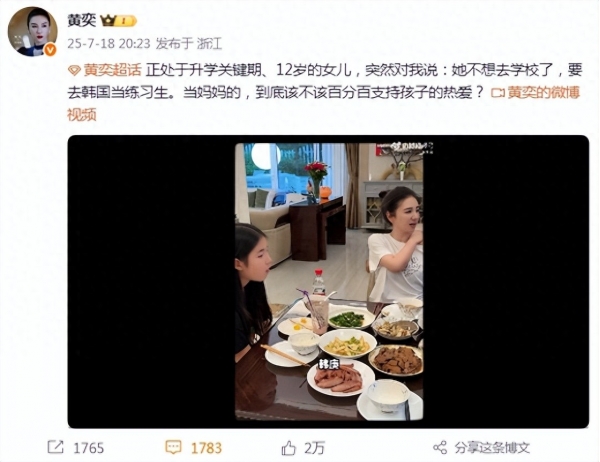 在黄奕回应网传女儿出道传闻之前,她曾发文透露12岁铛铛想去韩国当练习生,并且还不想去读书了。当时黄奕的发文一出,就引起了不小的争议,但都没有则此的质疑声大。