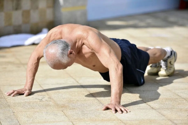 "标准俯卧撑"是手掌支撑在水平面上,头、背、脚后跟在同一平面,在最高点时呼气,最低点时吸气。