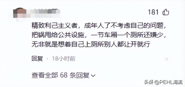 精致利己主义者,成年人了不考虑自己的问题,把锅甩给公共设施,一节车厢一个厕所还嫌少,无非就是想着自己上厕所别人都让开就行