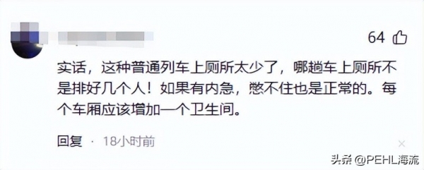 网友热评:实话,这种普通列车上厕所太少了,哪趟车上厕所不是排好几个人!如果有内急,憋不住也是正常的。每个车厢应该增加一个卫生间。