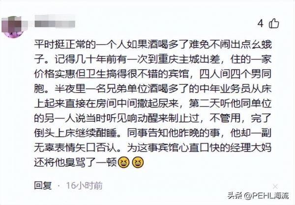 平时挺正常的一个人如果酒喝多了难免不闹出点幺蛾子。记得几十年前有一次到重庆主城出差,住的一家价格实惠但卫生搞得很不错的宾馆,四人间四个男同胞。半夜里一名兄弟单位酒喝多了的中年业务员从床上起来直接在房间中间撒起尿来,第二天听他同单位的另一人说当时听见响动醒来制止过,不管用,完了倒头上床继续酣睡。同事告知他昨晚的事,他却一副无辜表情矢口否认。为这事宾馆心直口快的经理大妈还将他臭骂了一顿