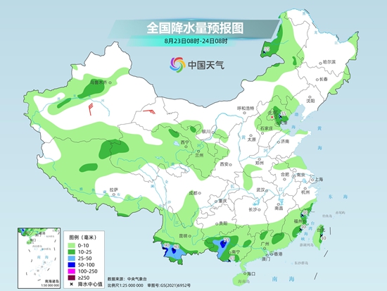 8月23日08时至24日08时,新疆南疆西北部和天山山区、西藏北部和东南部、青海西部和北部、甘肃中部、内蒙古东北部、河北东北部、北京东部、天津中东部、浙江南部、福建东部、广东北部、广西西部和北部、云南西南部、台湾岛东部等地部分地区有中到大雨,其中,云南西南部、广西西部等地局地有暴雨(50~90毫米)。新疆南疆盆地、甘肃河西等地部分地区有4~6级风。
