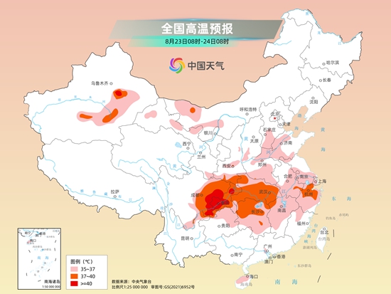 预计8月23日白天,四川盆地、重庆、湖北、湖南、浙江大部、安徽中南部、江苏中南部、上海大部、江西中北部、福建西北部、贵州北部、云南东北部、海南岛西北部以及新疆南疆盆地东部、甘肃河西、内蒙古西部、陕西中南部、山西南部、河北南部、山东北部和西部、河南大部等地有35℃以上高温天气,其中,四川盆地东部、重庆、陕西南部、湖北大部、湖南北部以及新疆南疆盆地东部等地部分地区最高气温37~39℃,局地可达40℃以上。中央气象台8月23日06时继续发布高温黄色预警。