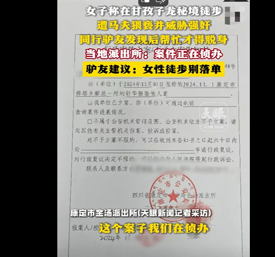 10月29日,一名喜欢徒步的女博主与两名男驴友前往甘孜州康定的"子龙秘境"徒步旅行,计划于11月1日结束。然而,在这段旅程中,她遭遇了雇佣的65岁马夫刘某华的猥亵行为。