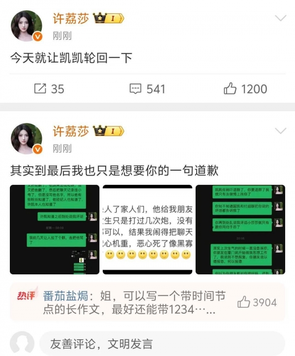 她直接宣布,和许凯分手了,现在不是情侣,没有其他关系。她同时晒出和许凯的聊天记录,还有许凯的照片。这样一来,舆论完全沸腾。