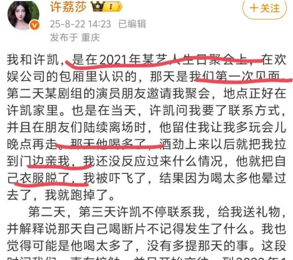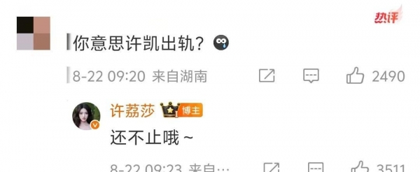 许荔莎不是一直很低调,她忽然主动回应。在社交平台上公布许凯在2022年底和赵晴一起。许荔莎说,自己亲眼看见许凯和赵晴在酒店。