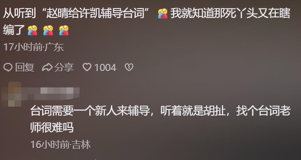 于正开直播解释,说许凯和赵晴只是一起对台词。网友质疑,觉得这个解释让人很难相信。有人留言说,这种理由没有说服力。
