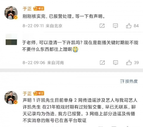 于正看到这些,第一时间在社交平台回应。他说许荔莎捏造事实,还表示已报警让警察调查。于正着急,在平台连发几条反击。
