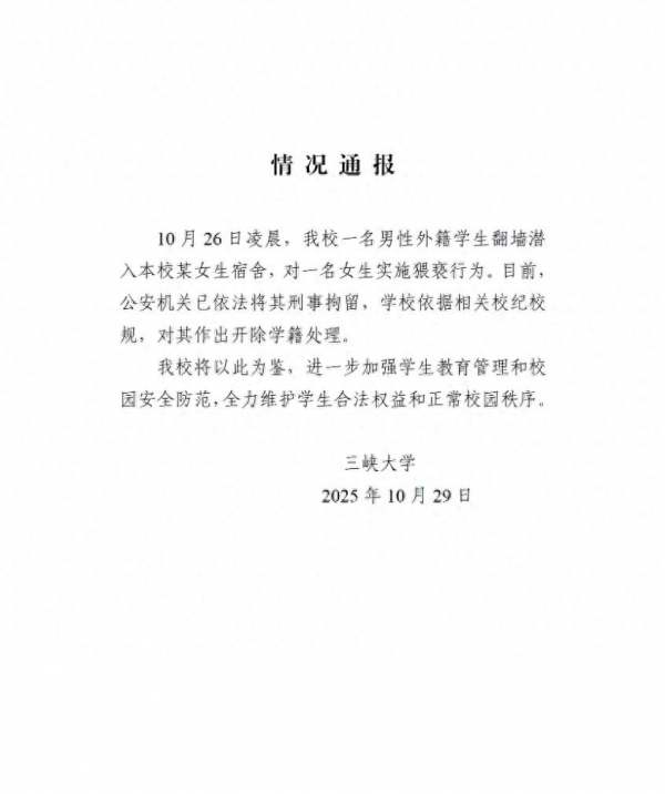29日下午,三峡大学发布通报称涉事留学生已被刑事拘留,学校依照校纪校规对其开除学籍,详情如下: