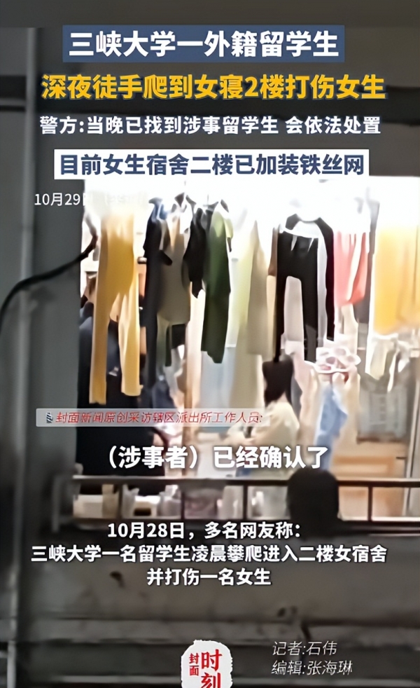 10月29日,三峡大学一名留学生凌晨爬楼进入女生宿舍事件引发网络关注。