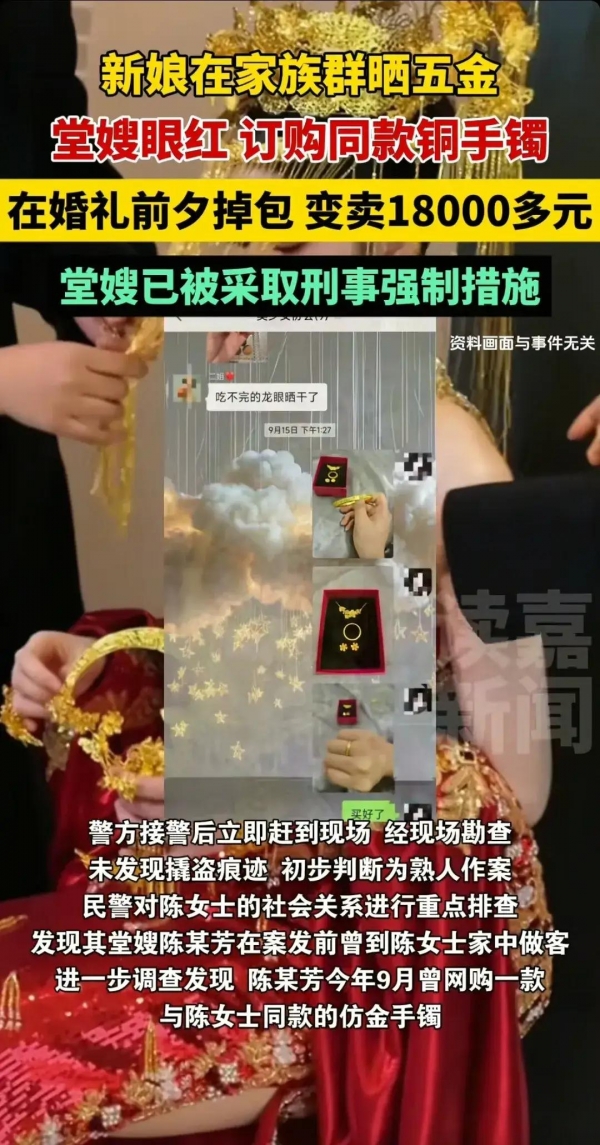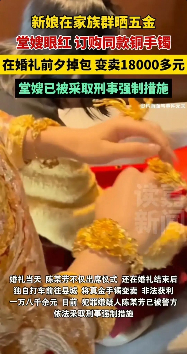 事情要从9月中旬说起。准新娘陈女士为筹备婚礼,精心购置了金手镯等首饰,并在家族群中分享喜悦。这本是再平常不过的举动,却不想被有心人惦记。其堂嫂陈某芳见财起意,竟萌生歹念。她不动声色地在网上订购同款仿制品,静待时机。婚礼前夕,陈某芳借做客之名登门,趁人不备完成调包。更令人咋舌的是,婚礼当天她不仅全程参与,还在喜宴结束后立即将赃物变现。这般处心积虑,这般胆大妄为,实在令人不寒而栗。