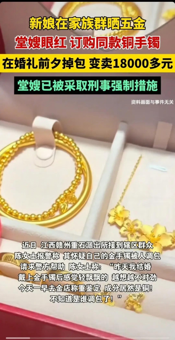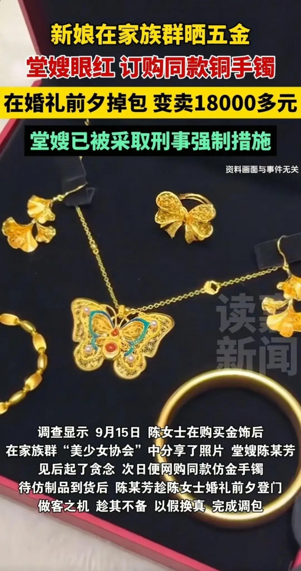 更值得警惕的是,此类"熟人作案"并非个例。从家族群炫耀引发的觊觎,到婚礼现场实施的调包,每一个环节都暴露出现代人防范意识的薄弱。这提醒我们:害人之心不可有,防人之心不可无。即便面对至亲,也要保持必要的警惕。