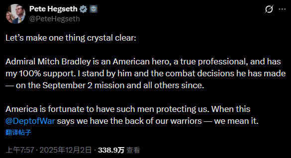 "让我们澄清一件事,布拉德利是一位美国英雄,一位真正的专业人士,我100%支持他,"赫格塞思写道,"我支持他以及他做出的作战决定,包括9月2日的任务以及此后的所有任务。"