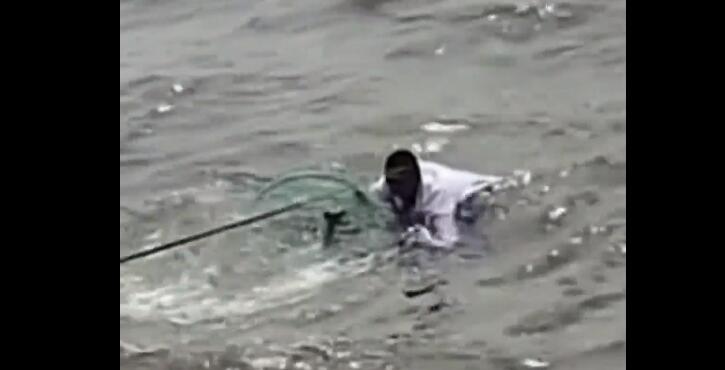 7月30日,云南,男子捕到大鱼,脚下一滑摔进水里,被救时还死死抓着捕网不松手。