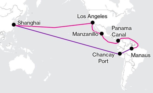 结果是,中秘贸易中出现了一种奇怪的现象:明明是中国从秘鲁购买的铜和锂,却需要用小船送到洛杉矶、巴尔的摩等美国(或巴拿马等中美洲国家)的大港,重新分装到COSCO的大船上;反过来,COSCO运送的中国新能源汽车等工业品也只能先送到美国或中美洲重新分装,然后再用小船送到南美。