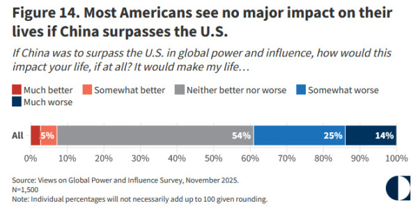 54%的受访者表示,如果中国在全球实力和影响力上超越美国,他们的生活不会受到影响。报告作者、卡内基国际和平基金会高级研究员斯蒂芬·沃特海姆(Stephen Wertheim)表示,这反映出美国民众与华盛顿的政策专家之间存在脱节,美国公众不愿意为美国政府"遏制中国实力和影响力"的目标付出太大代价。