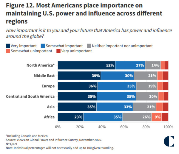 尽管美国民众普遍支持美国政府维持在海外的全球影响力,但多数受访者更重视美国在北美地区的影响力。对于亚洲地区,主张美国维持力量和影响力"非常重要"或"比较重要"的受访者分别为35%和33%,合计68%,在所有地区中排在第五位。
