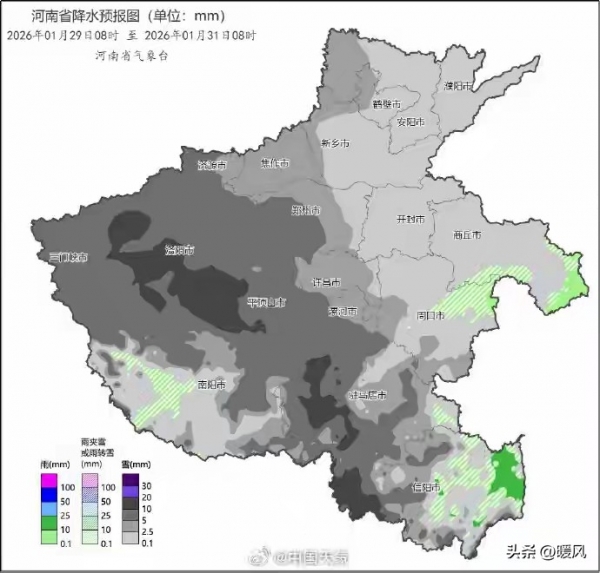 1月29日,全省将迎来阴天,降雪天气全面铺展:中西部将出现中到大雪,局部暴雪,这一区域也是本次河南降雪强度最大的地方;东部、南部受气温影响,先出现小雨或雨夹雪,后续随着气温下降转为纯雪;其余县(市、区)则以小到中雪为主 。