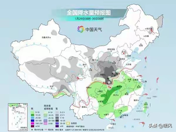 与降温相伴而来的,是中东部大范围的降水天气。1月29日至31日,青藏高原东部、西北地区东部、华北、黄淮西部和南部、江汉、江淮、江南西部等地将先后出现小雪或雨夹雪,其中陕西中南部、山西南部、河南中西部成为本次降雪的核心区域,部分地区有中到大雪,局地暴雪 。而湖北西部、湖南西部及贵州东部等地,还将出现冻雨天气。