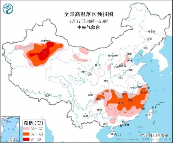 预计7月17日白天,重庆、贵州东部、湖北南部和西部、湖南、江西、浙江、福建、安徽南部、江苏南部、上海、广西东北部、广东北部以及新疆南疆盆地中东部、内蒙古西北部、甘肃中部、陕西东北部、北京中南部、河北南部等地有35℃以上的高温天气,其中,南疆盆地中东部、重庆大部、湖北南部、湖南中北部、江西大部、浙江大部、福建中北部等地部分地区最高气温37~39℃,局地可达40℃以上。