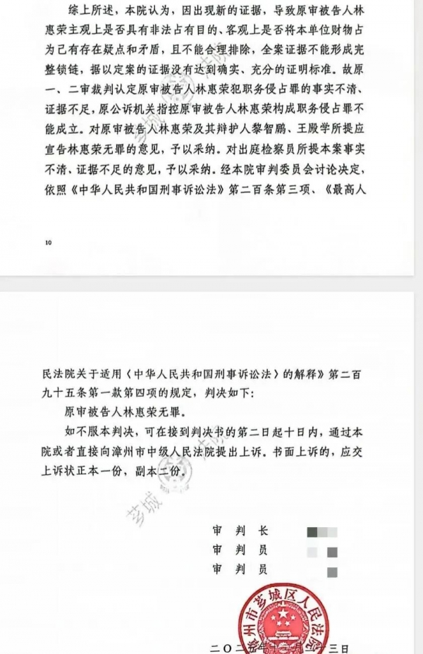 2024 年 6 月,漳州中院撤销了原判决,把案子发回重审。2025 年 12 月 23 日,漳州市芗城区法院开庭,当法官念出 "林惠荣无罪" 时,她攥着丈夫的手,手心里全是汗,眼泪终于忍不住掉了下来 -- 这一天,她等了 15 年。