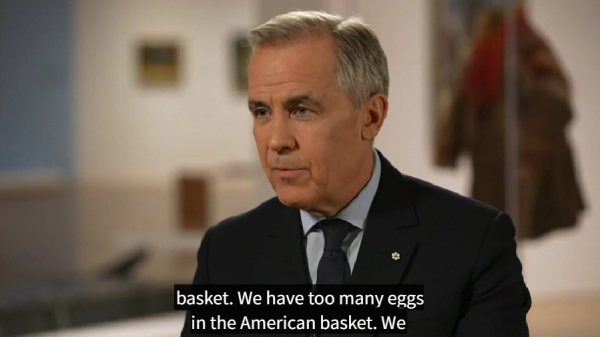 卡尼在2025年终专访时称:太多鸡蛋装美国篮子里了,要拓展与中国的关系。CBC视频截图