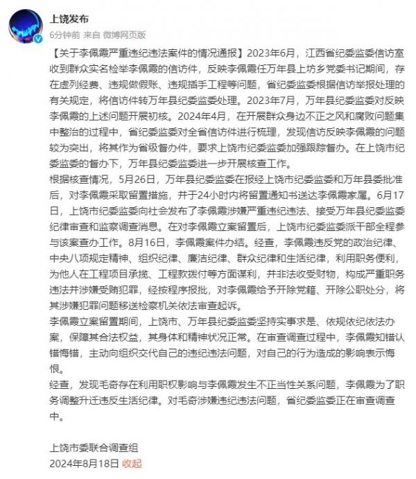 刚刚,江西省上饶市委联合调查组发布《关于李佩霞严重违纪违法案件的情况通报》,全文如下: