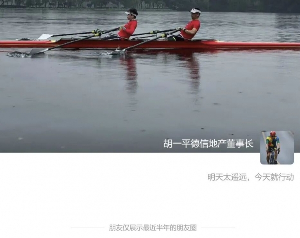 "明天太遥远,今天就行动"是胡一平写在社交平台的个人签名,他爱好骑行、跑步及划船运动。直到现在,他的个人视频号上还更新着在湖州莫干山的运动剪影,备注为"铁三(铁人三项)爱好者"。
